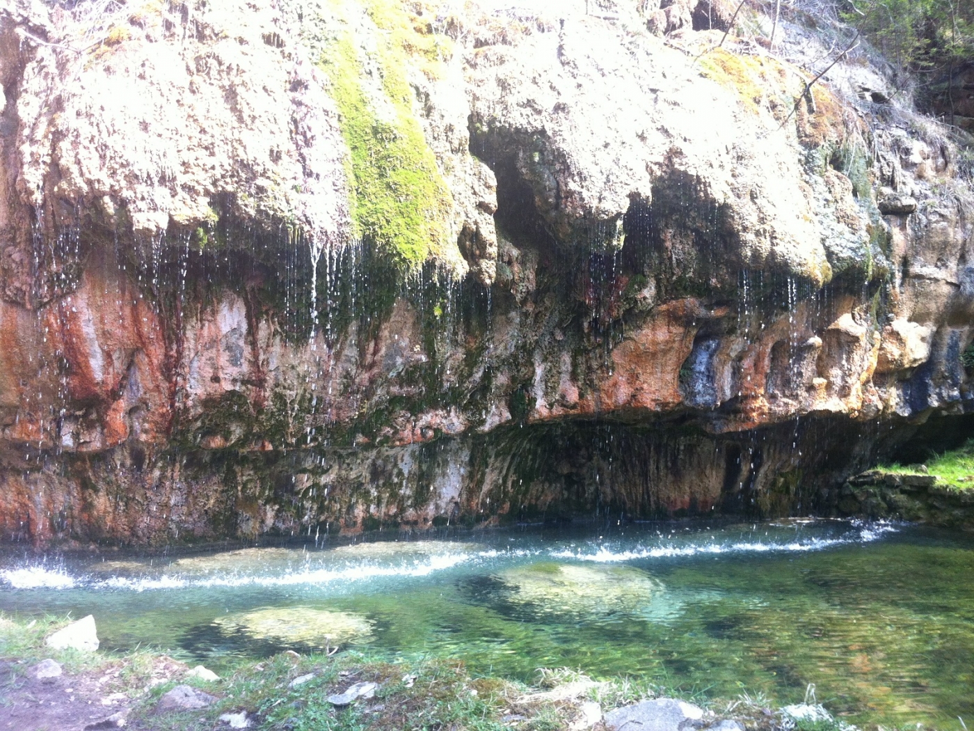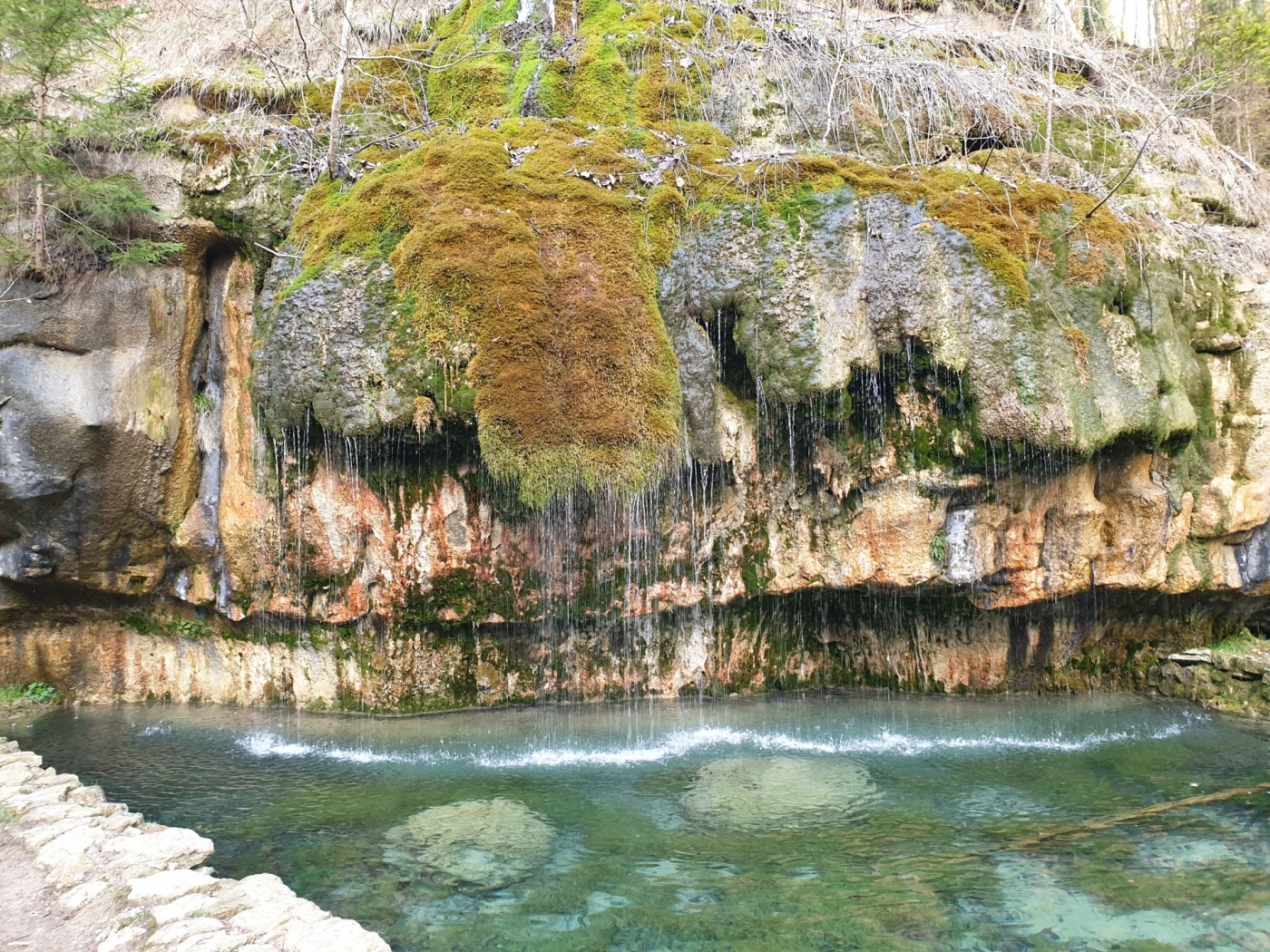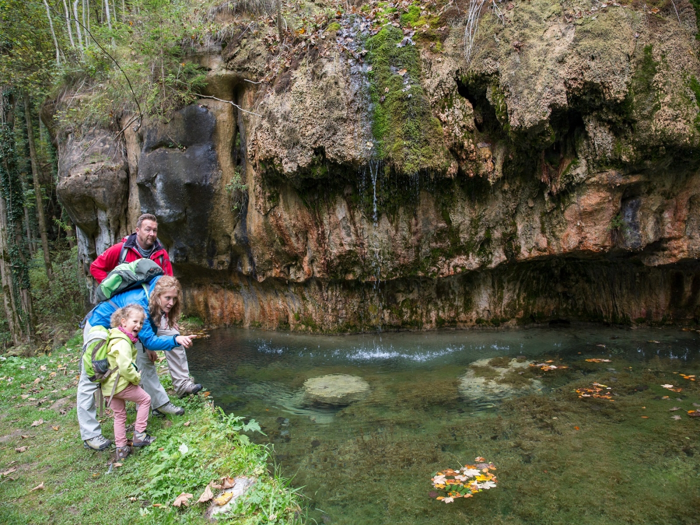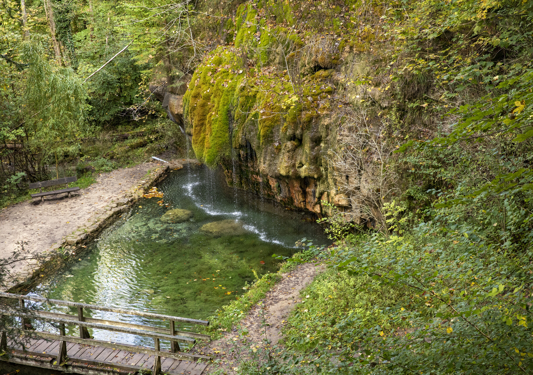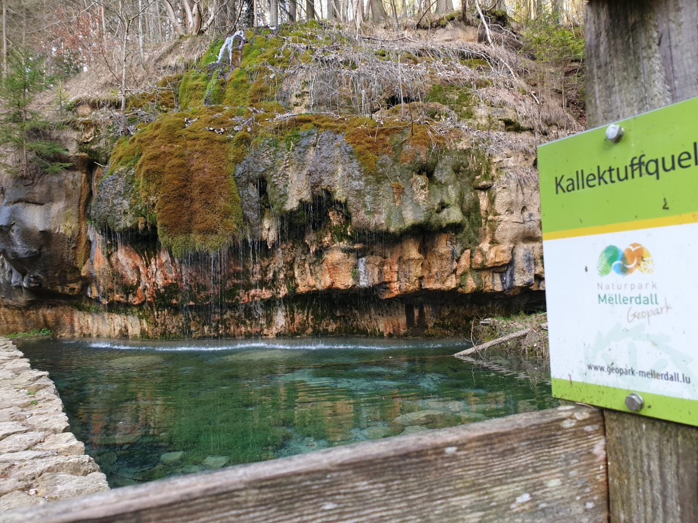 At the Travertine source situated in the valley of the Ernz Noire crystal-clear calcareous water flows over a rock formation into a basin. The colors of the water and the rock as well as the variety of moss are impressive.