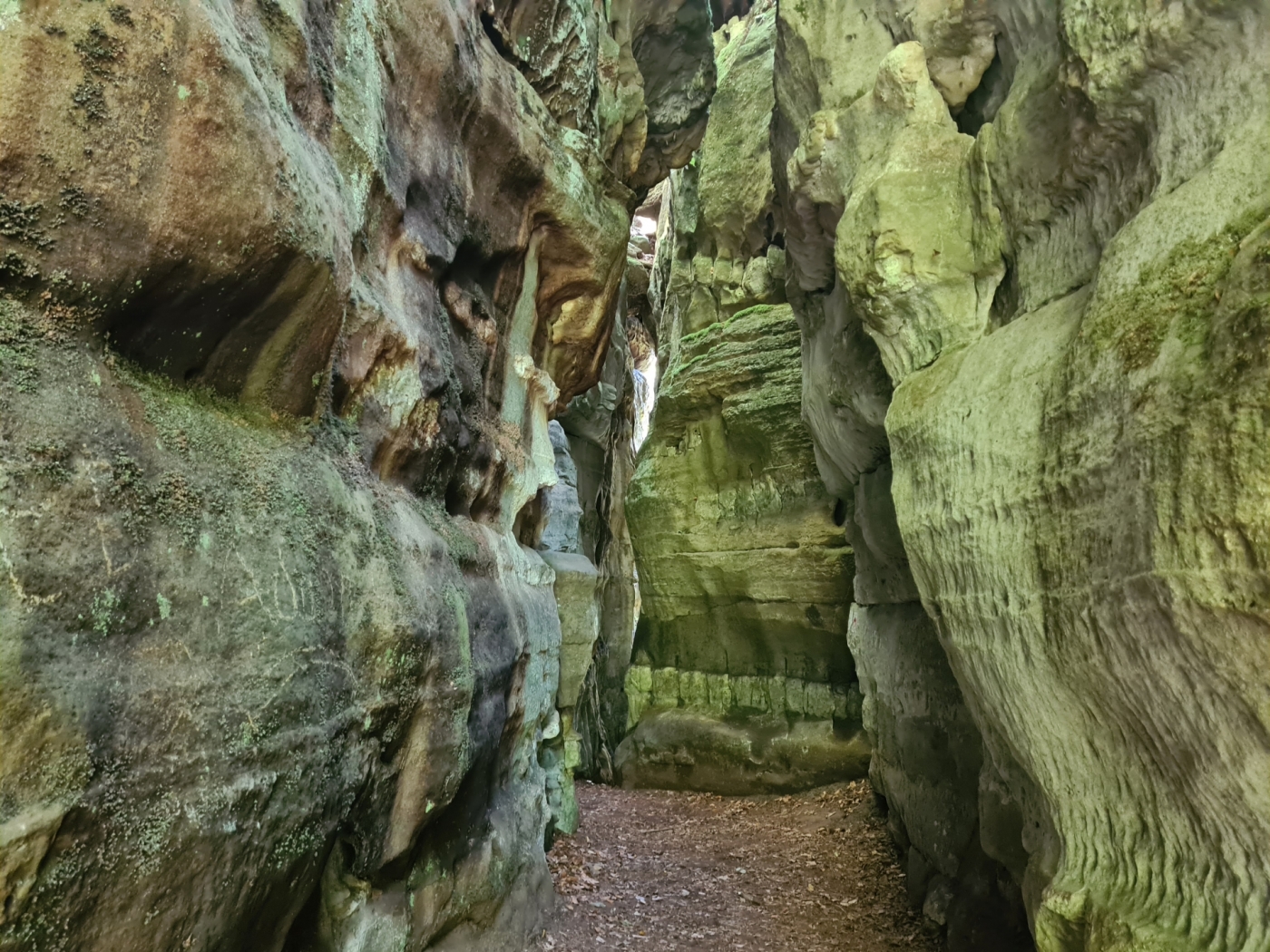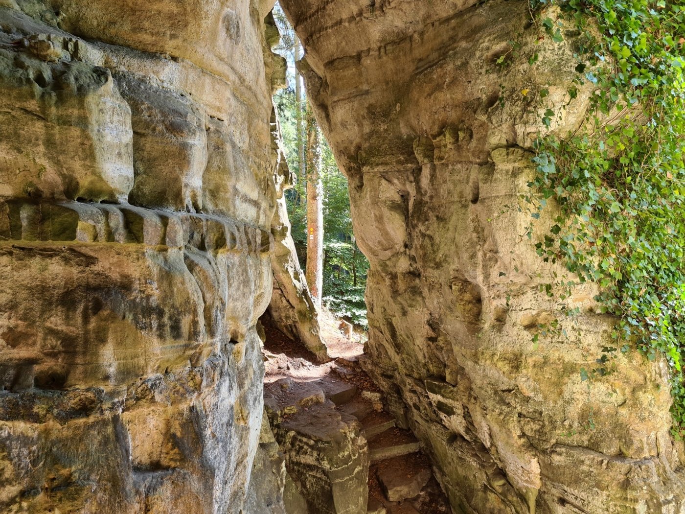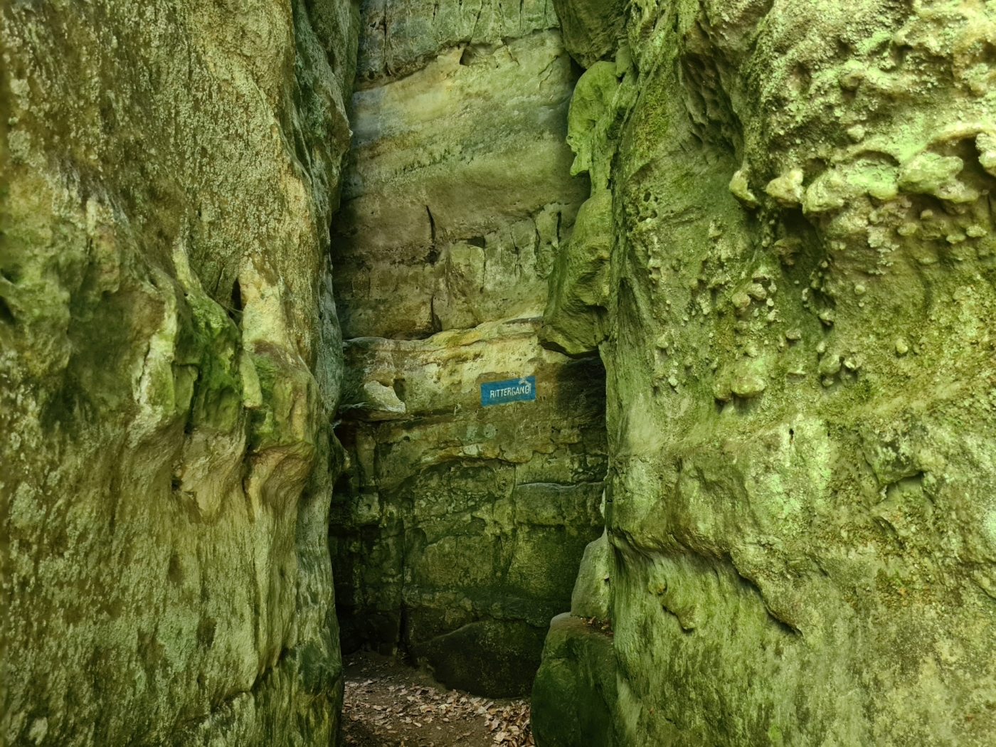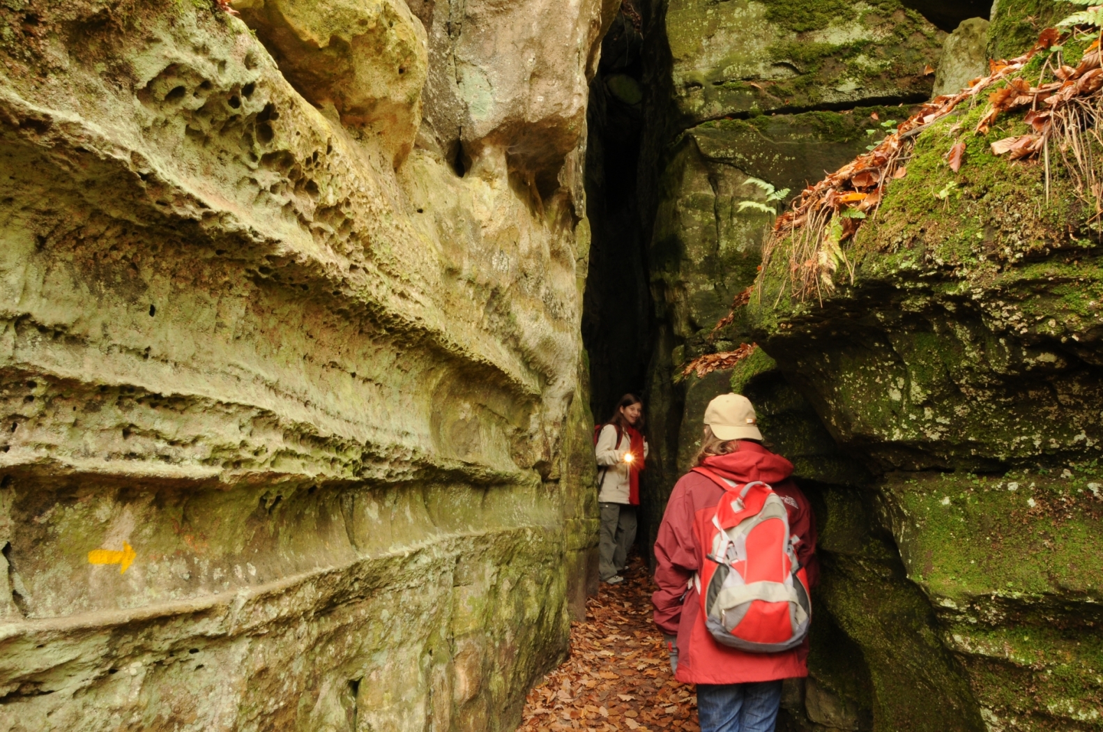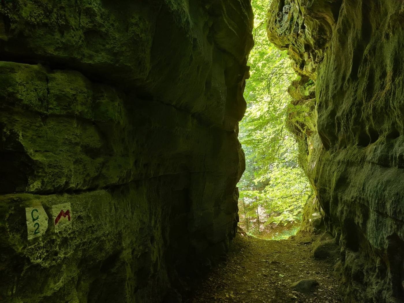 De rotspassage is op plaatsen zo smal dat alleen "eenrichtingsverkeer" mogelijk is. Een zaklamp is nodig om de rotstunnel te verkennen via een pad.